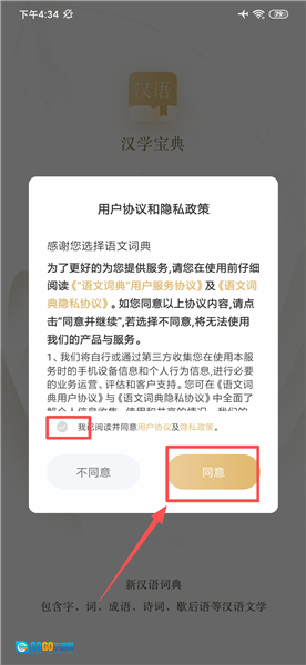在汉学宝典里勾选同意选项并点击“同意”按钮,即可进入个人中心页面。
