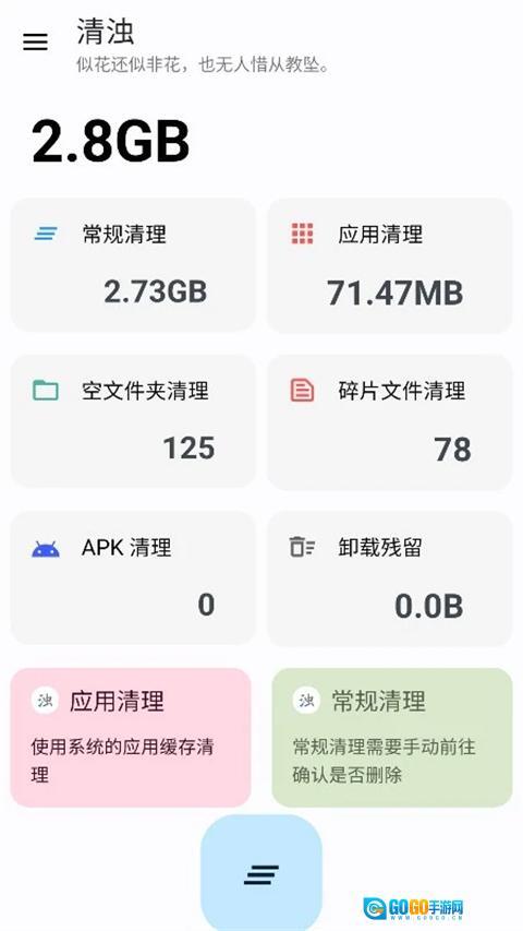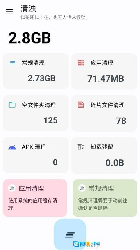 清浊是一款超实用的垃圾清理工具,能帮您有效清理手机里的垃圾广告,让清理后的手机操作更流畅。它具备极速清理功能,一键就能彻底删除垃圾文件、无用图片和不常用的各类数据,是非常好用的清理助手。用户可以随时随地使用,让手机在日常使用中健步如飞,操作体验和刚买时一样流畅丝滑,并且致力于为用户带来最优质的使用服务。