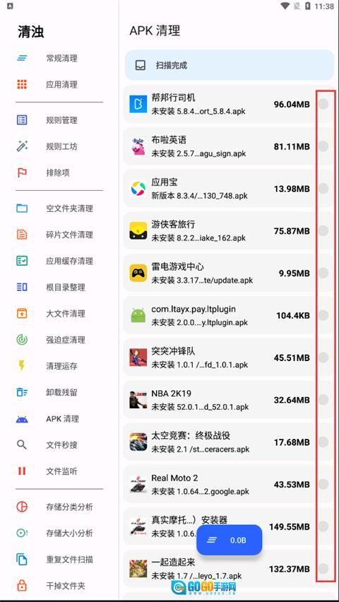 APK清理功能:帮助查找手机中留存的APK安装包,并支持删除操作,以此释放被占用的存储空间。