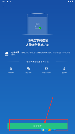 在清理页面,点击立即清理按钮,若弹出权限申请,点击同意授权,进行手机空间清理操作。
