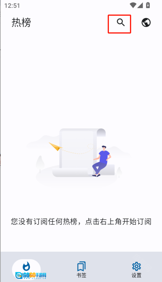 打开小鱼报应用后,其初始界面默认不显示任何热榜内容。若需订阅特定新闻,需点击界面右上角的搜索图标,随后在弹出的搜索框中输入目标内容(例如“百度”)即可完成订阅操作。