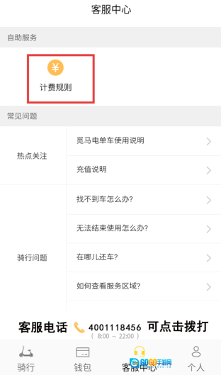 你可以点击底部的【客服中心】选项,进入客服中心页面后,找到并点击【计费规则】,这样就能查看电单车的收费标准了。