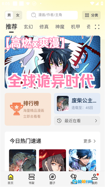 首页所呈现的推荐页面,涵盖高分推荐、热门推荐以及猜你喜欢等板块。页面顶部设有分类切换功能,而在左上角则能够实现男频与女频的切换。
