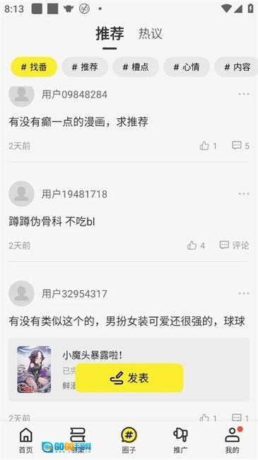这款软件给大家去除了广告,无需注册登录。要是之前下载的漫画失效了,直接换上这款就行,功能基本一样。没有广告且完全免费,堪称漫画界的良心之作!软件还设有圈子功能,众多同好会在里面探讨漫画剧情~