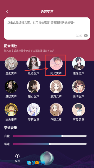 在变声页面,挑选阳光男声这类目标音色,将其应用于文本配音。