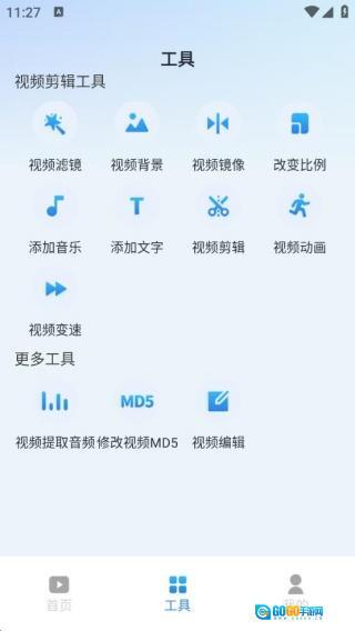 提供滤镜、背景、镜像、比例、音乐、文字、动画、变速等基础剪辑工具,以及视频提取音频、修改 MD5 等进阶功能。