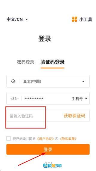 在验证码输入框中填入收到的验证码,点击登录按钮即可完成账号登录流程。