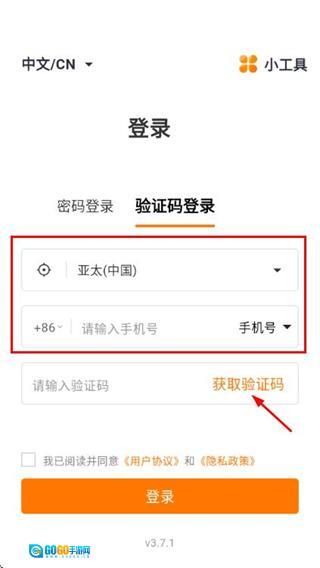 在手机验证登录页面输入手机号,勾选相关协议后,点击“获取验证码”按钮。