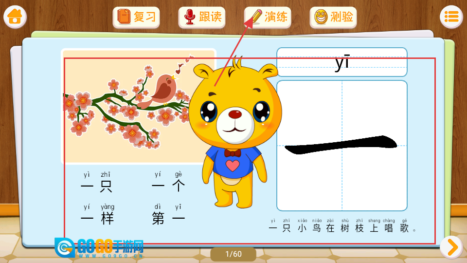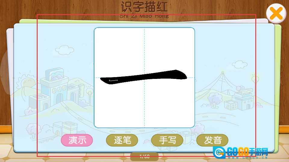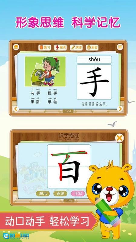 书写描红操作:进入书写模块后,宝宝能跟着引导一笔一划开展汉字描红练习,慢慢学会正确的汉字书写笔画顺序。