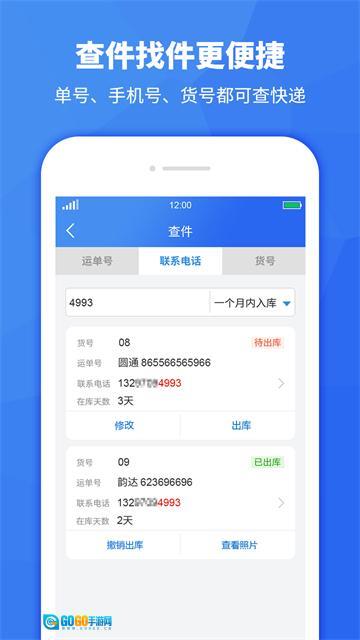 可通过手机号、运单号、货号进行查询,支持扫码与手动输入两种方式,同时支持精确查询,以及查询后的修改和出库操作。