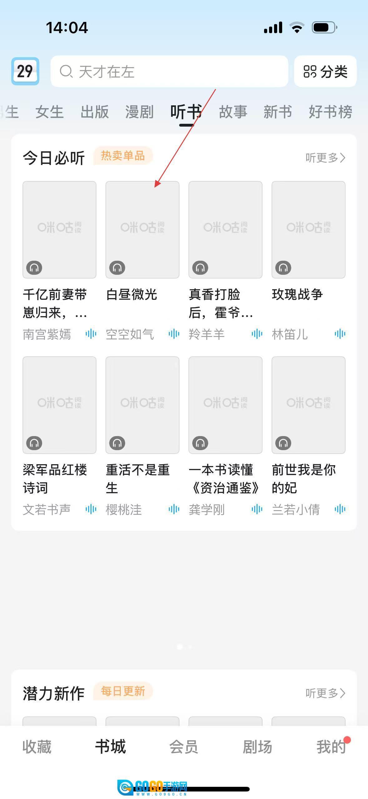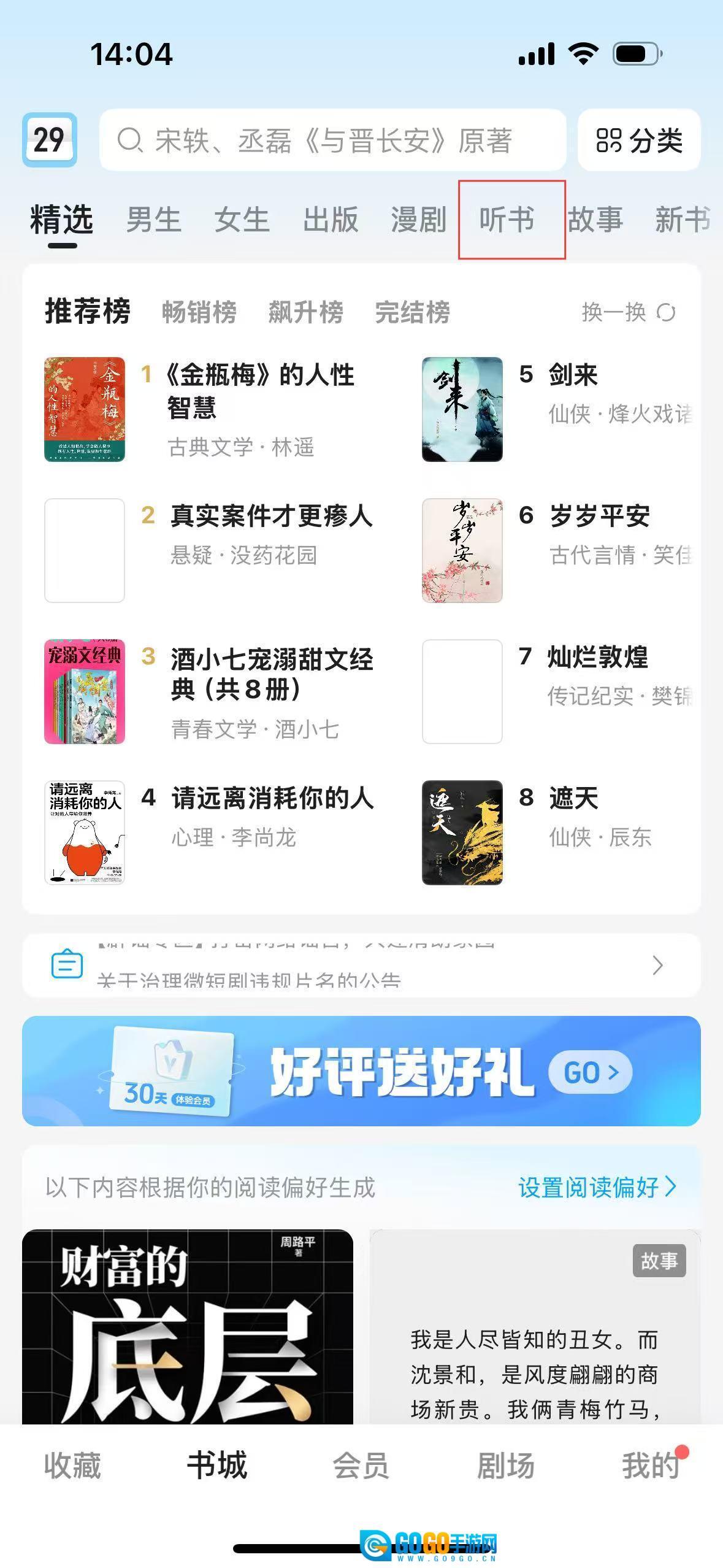 在书城点击听书,进入听书推荐页面。