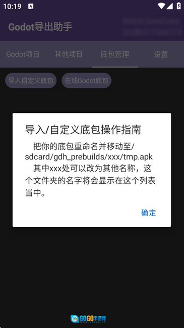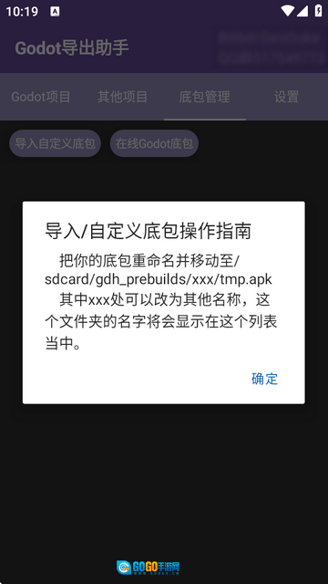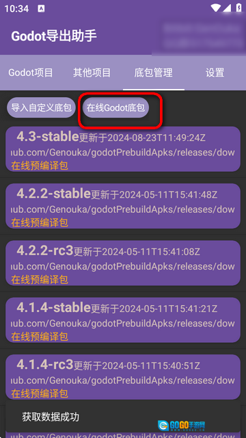 注意:首次使用时,若要选择适合项目的Godot版本的预编译底包,可点击右上角的“使用在线包”。若没有合适的底包,请向该项目提交issue。