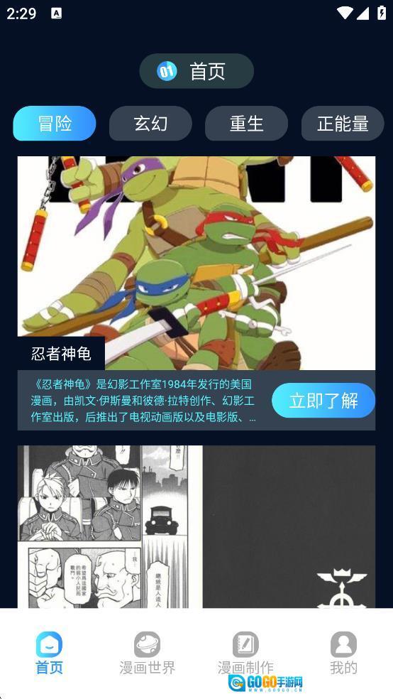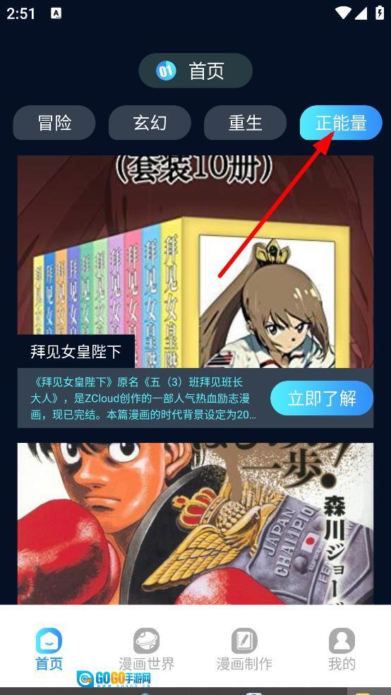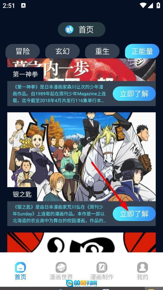 在正能量分类的漫画列表里,找到目标漫画后点击它旁边的“立即了解”按钮,就能进入该漫画的详情页面。