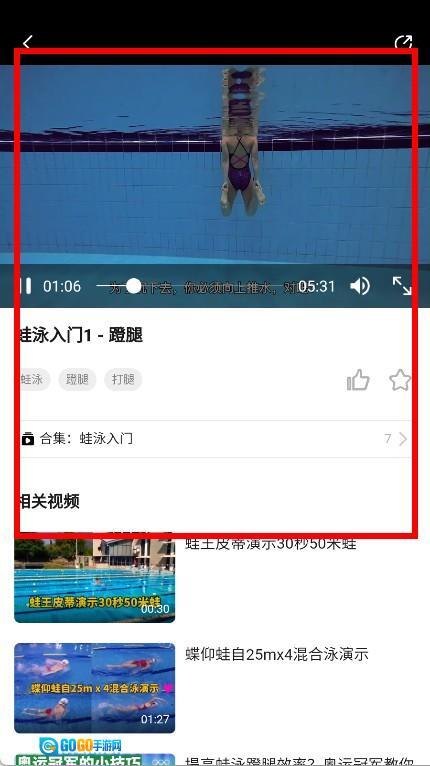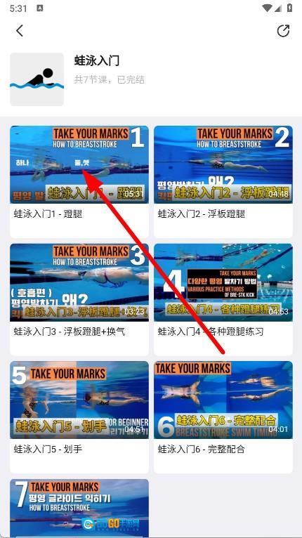 在蛙泳入门课程的列表里,挑选你想要学习的目标课程,然后点击进入该课程的视频播放页面。