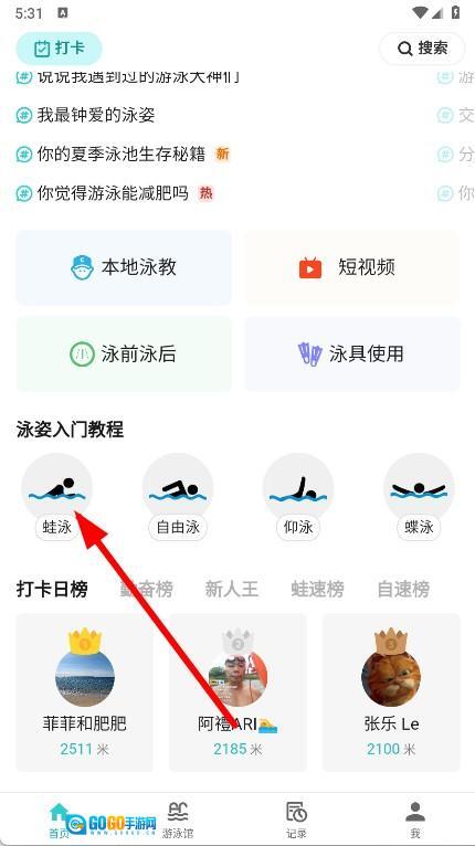 打开游泳社,在泳姿入门教程板块点击蛙泳。