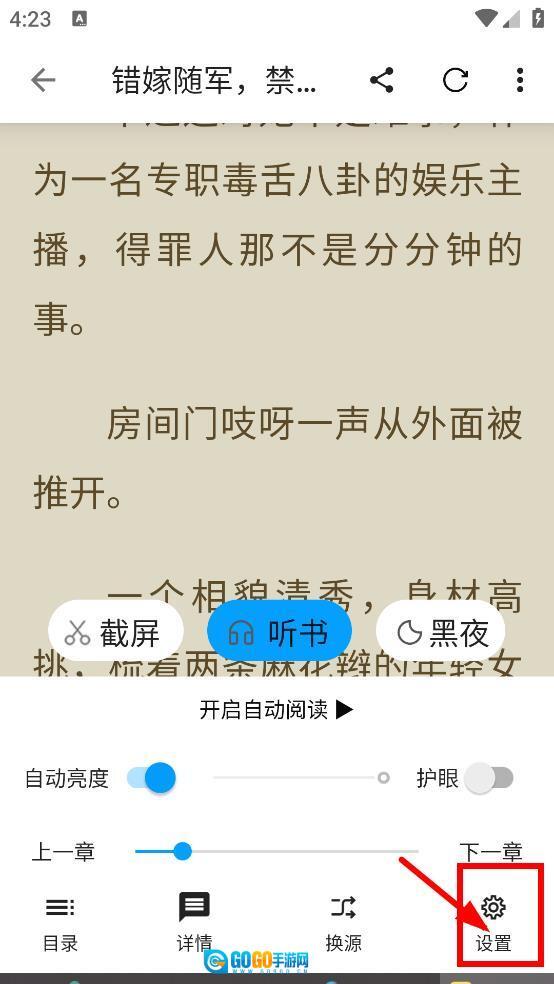 在书籍阅读界面,轻点屏幕调出功能栏,选择设置选项,即可进入设置页面。