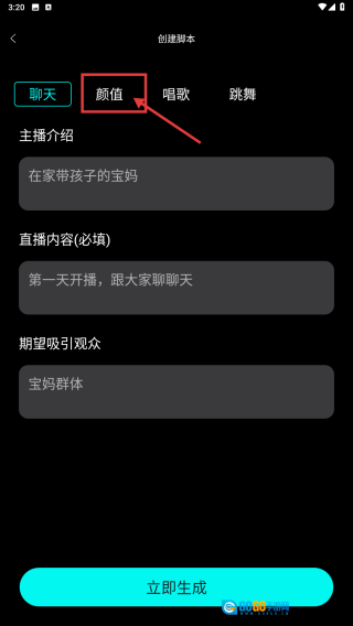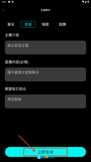 信息填写完毕后,点击“立即生成”按钮,即可生成颜值类直播脚本。