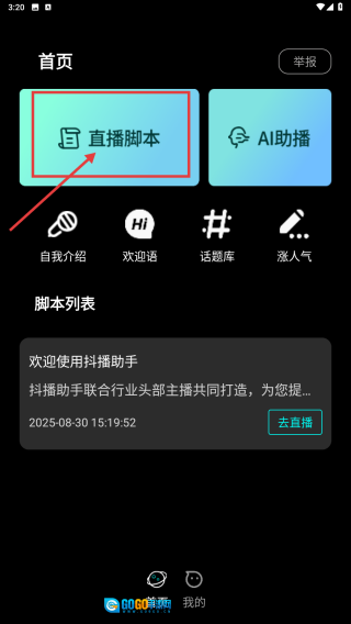 打开抖音助手应用,点击直播脚本选项,进入创建脚本页面。