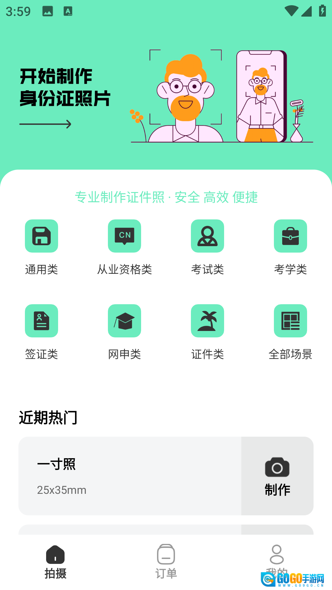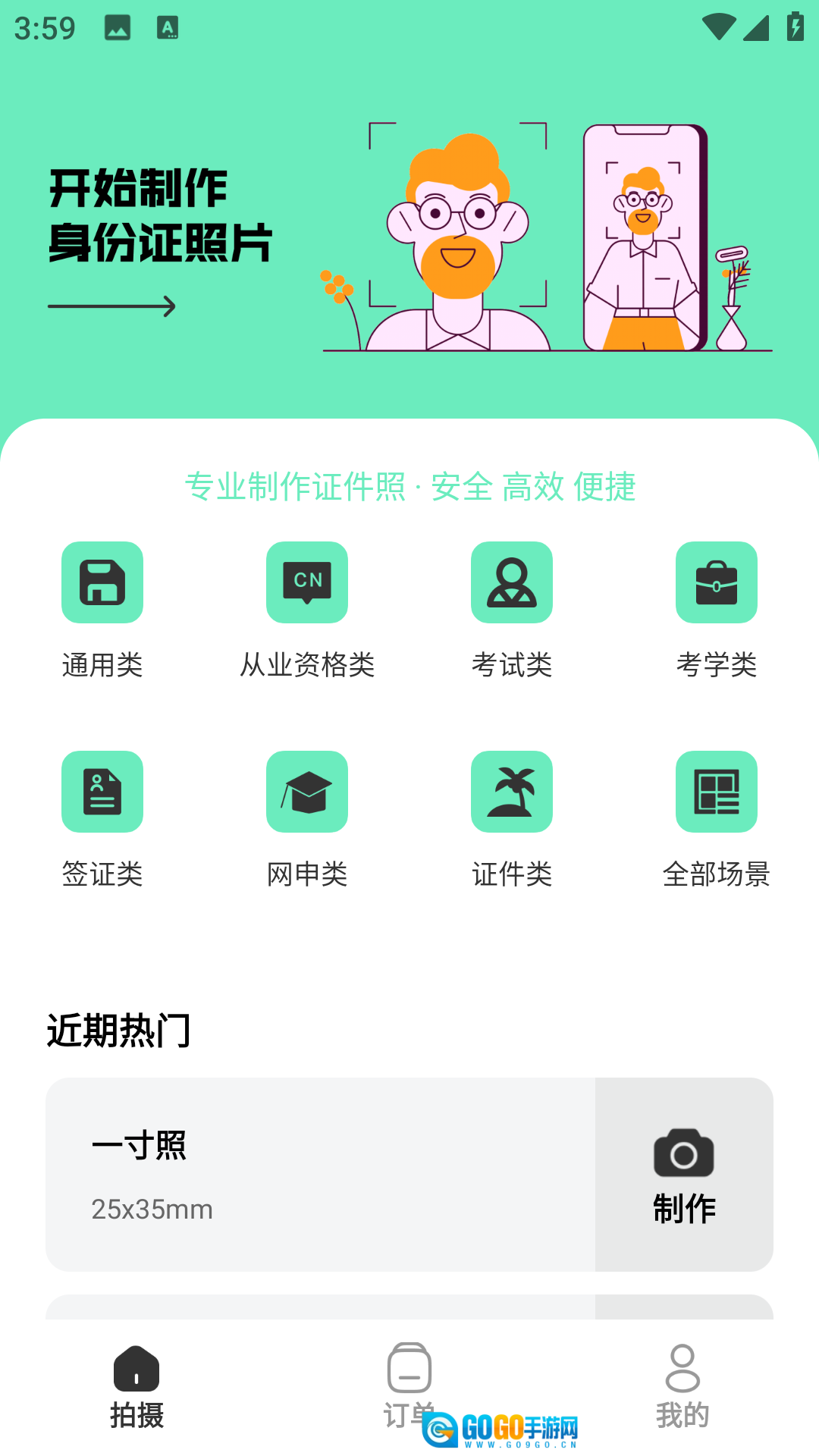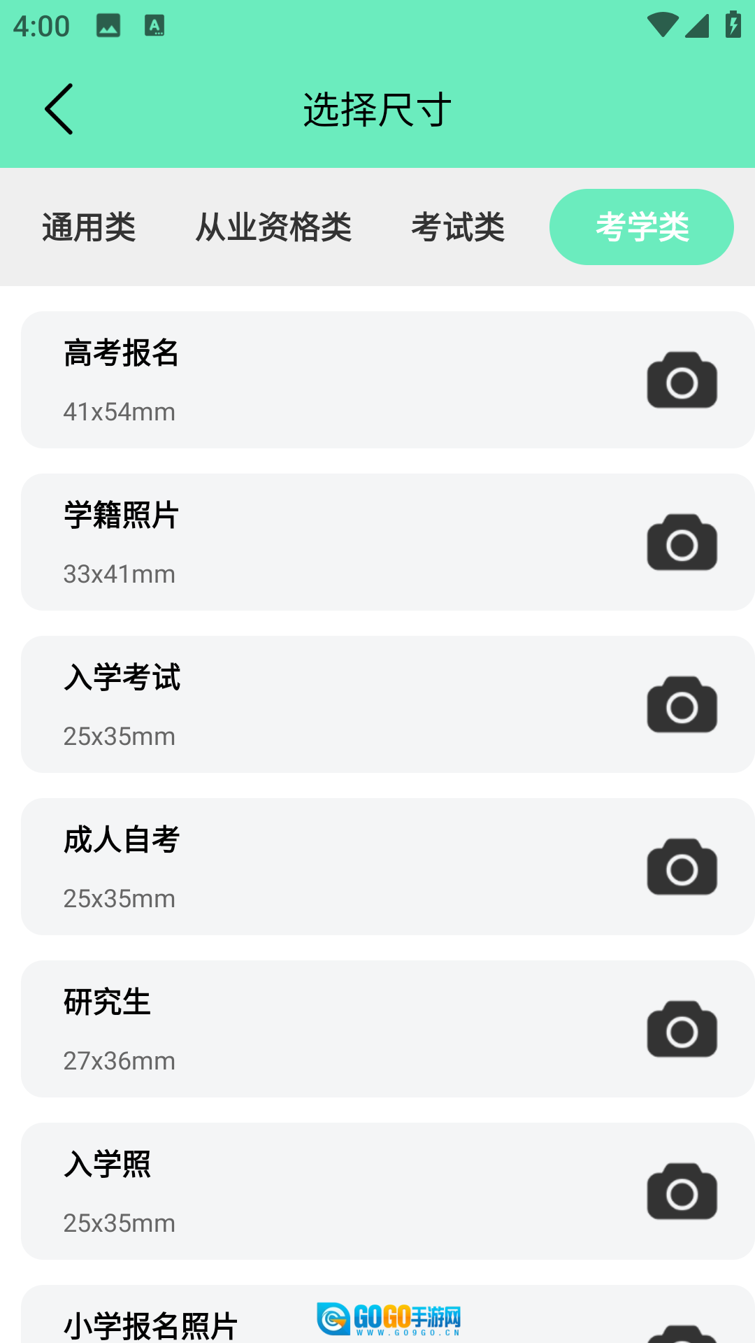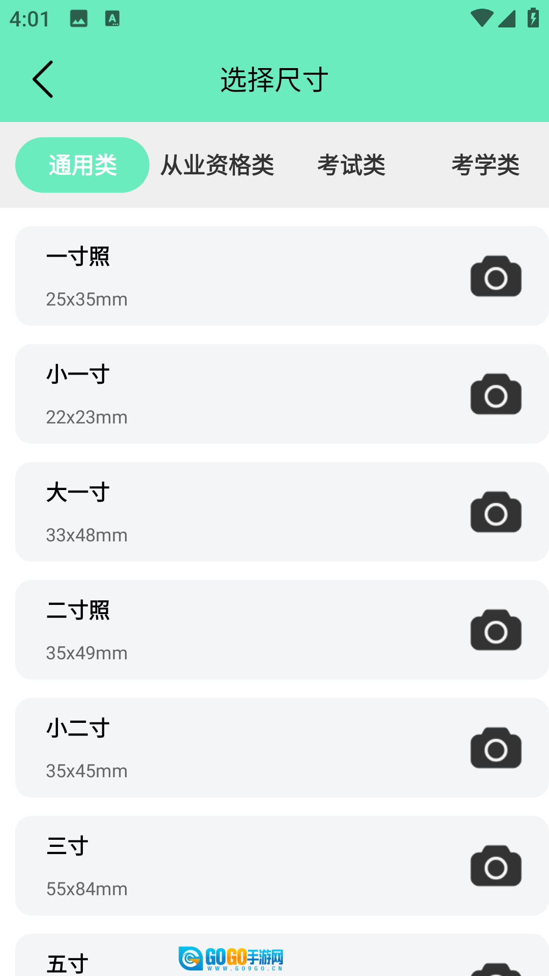 进入【拍摄】界面,选择所需类型或证件照尺寸。