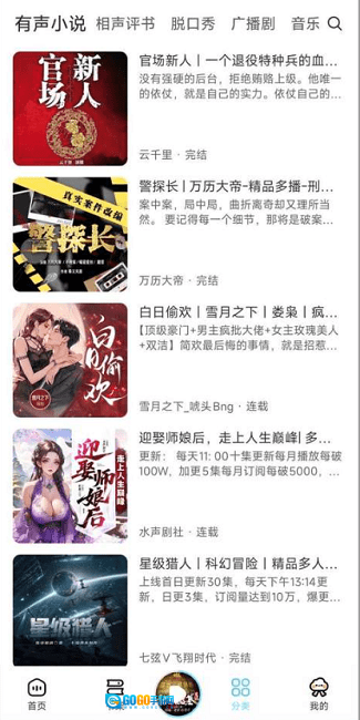 打开海云听书的瞬间,我就确定自己邂逅了心头好。首页推荐的内容全是精华,更新速度快得让人惊喜。分类页面清晰规整,就算有选择困难也能轻松找到心仪的作品。