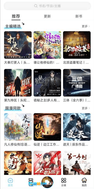 首页核心栏目展示:软件首页清晰呈现推荐、更新、新书三大核心板块,每日自动推送海量有声资源,让用户能更便捷地获取听觉内容。