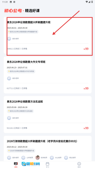 在初心公考的精选好课板块里,找到袁东2026申论超大杯刷题提升班这门课程并点击进入,就能看到课程的详细信息页面了。