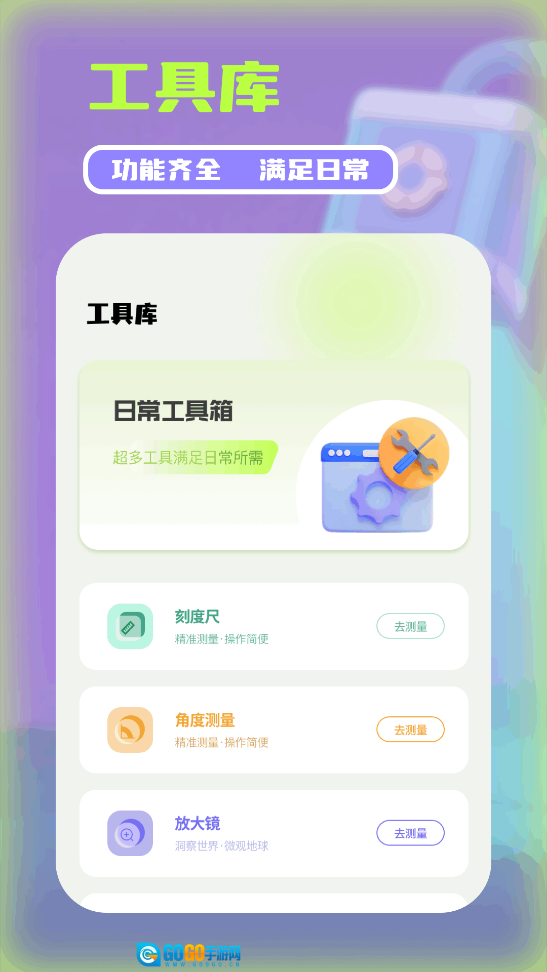 工具库中收纳了各类实用的日常小工具,像可测量距离的刻度尺、量角器,以及中老年人常用的放大镜等功能都包含在内。
