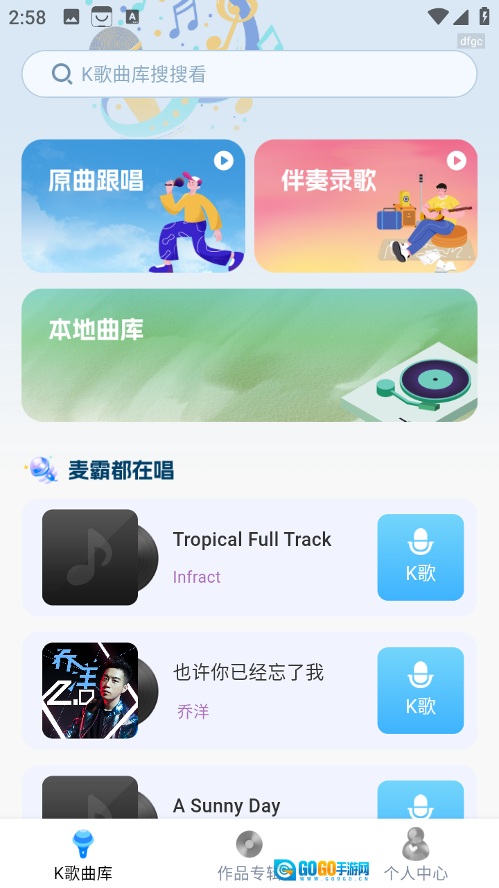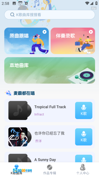K歌曲库涵盖原曲跟唱、伴奏录歌、本地曲库等多个版块,此外还收录了众多麦霸热唱的歌曲。