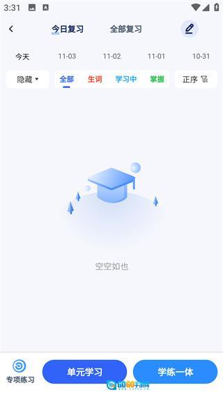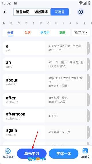 在单词学习页面,点击单元学习按钮,即可进入单词详情学习页面。