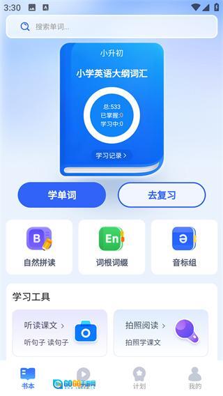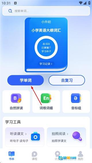 在《奇思妙想记单词》的书本页面中,点击“学单词”按钮,即可进入单词学习页面。