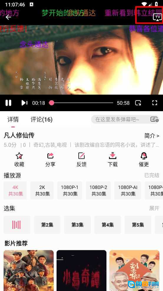 2、进入播放界面后,点击右上角的“TV”投屏图标,启动投屏功能。