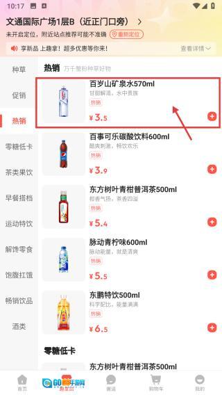 在热卖商品列表里,找到百岁山矿泉水570ml这款商品并点击,就能进入它的商品详情页面。
