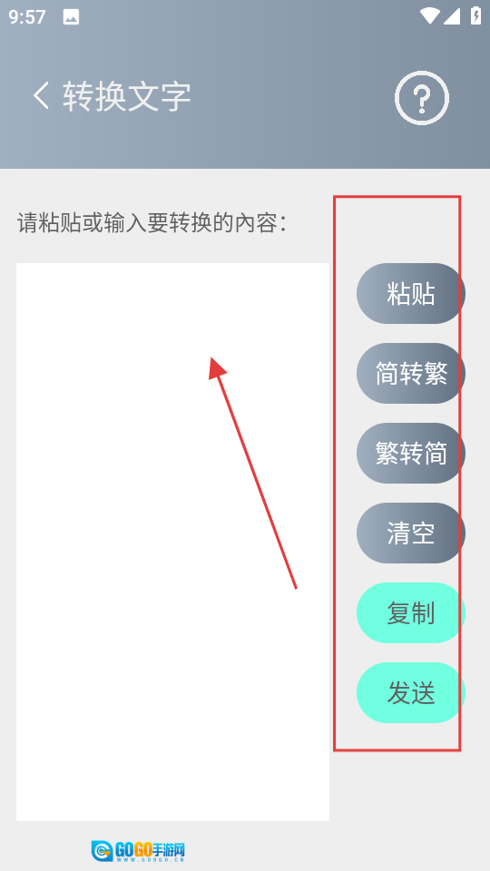切换文字页面,粘贴或输入内容,利用简转繁、繁转简等功能,完成操作后复制或发送。