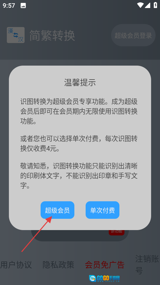 触发识图转换功能后,系统会弹出提示窗口,提供超级会员和单次付费两种选项。用户可在了解相关功能限制后,从中选择合适的付费方式。