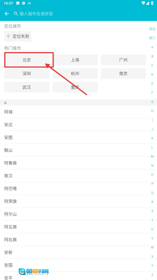 在城市选择页面,点击北京这类热门城市,就能把该城市添加至天气查看列表,进而获取其对应的天气信息。