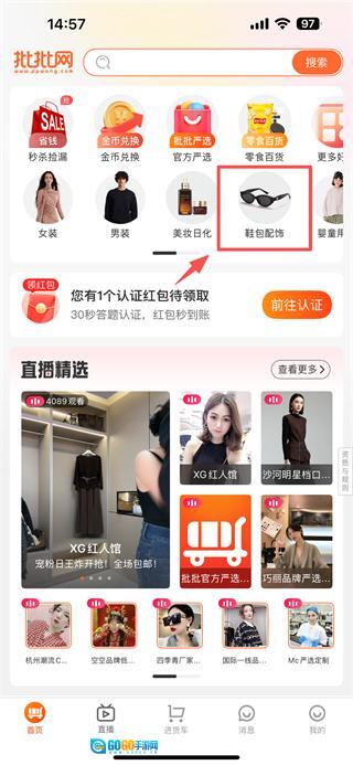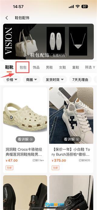 打开电商类应用,点击鞋包配饰分类标签,进入鞋包配饰商品专区。