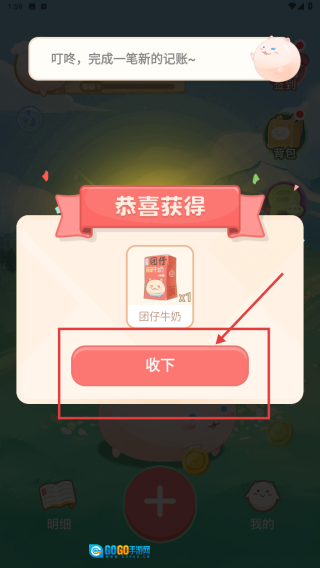 记账操作完成后,会弹出奖励提示窗口,点击“收下”按钮即可领取图仔牛奶奖励,至此整个流程结束。