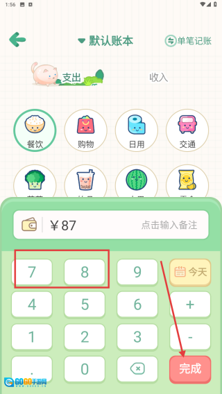 在记账页面选择餐饮等支出类型,输入87元之类的金额,再点击完成按钮提交记账。