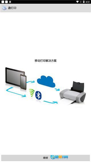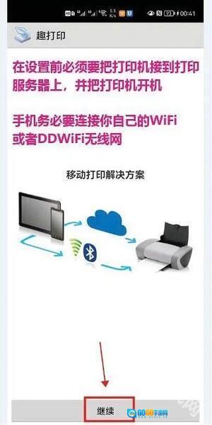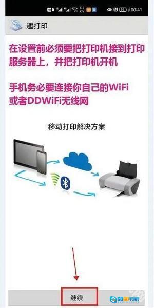打开趣打印应用后,系统会提示需将打印机连接至服务器并开启电源;同时手机要连接WiFi,之后点击“继续”按钮即可。
