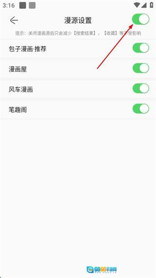 在漫源设置页面,可通过开启来开启漫画资源来源。