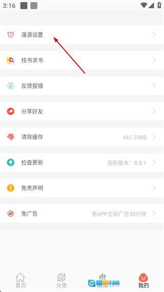 在个人页面中,找到并点击“漫源设置”选项,即可进入漫源设置页面。