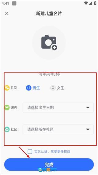 在新建儿童名片的页面,把相关信息填写好后,点击完成按钮,就能完成儿童名片的创建。