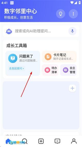 在数字邻里中心的首页,找到并点击“问题来了”选项,随后进入选择家庭名片的页面。