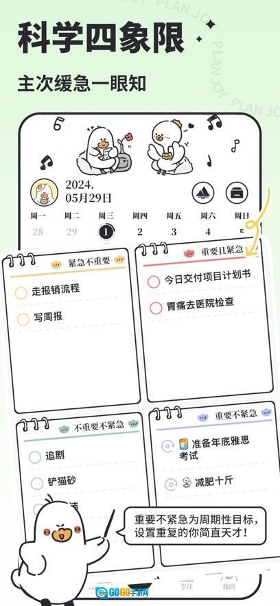 布局智能适配:任务象限并非固定分类,添加重复计划时,系统会依据任务周期特性,智能推荐更适配的象限归属,优化任务布局。