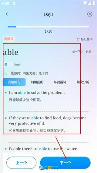 在完成当前单词的学习后,点击“下一个”按钮,就能继续进行下一个单词的学习。