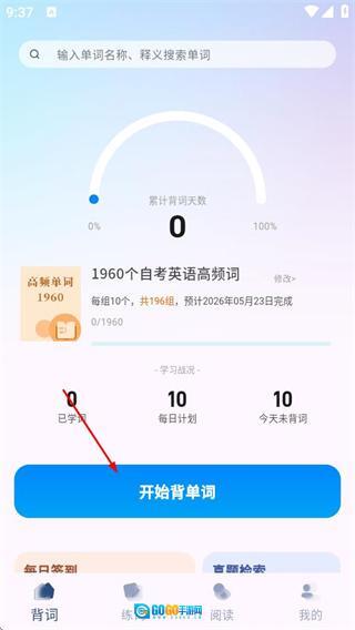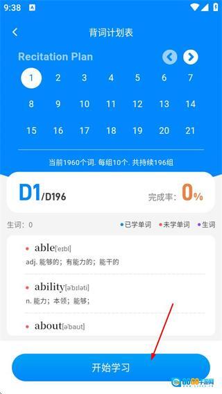 在背词页面,点击“开始背单词”按钮,即可进入背词计划表页面。