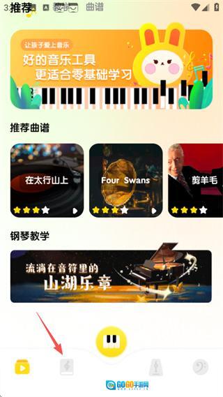 在自由钢琴的首页,点击页面下方的琴谱图标,就能进入琴谱页面啦。