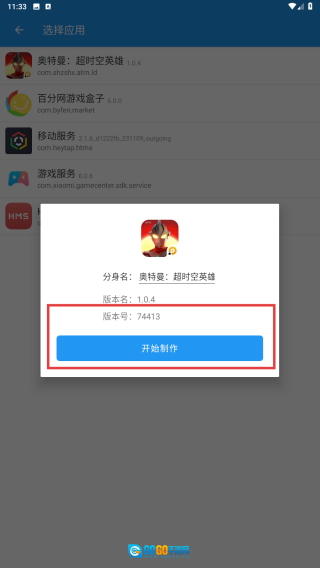 在选择应用的页面,点击目标游戏(例如奥特曼:超时空英雄)后,会弹出制作确认框。