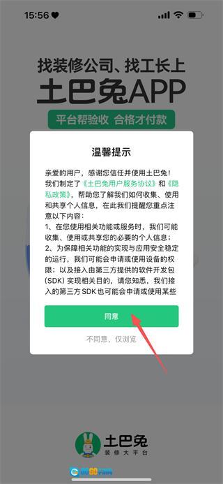 打开土巴兔装修应用,点击同意按钮后,就表示您已同意相关协议,进而可以进入后续流程。