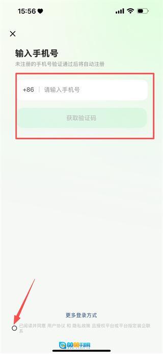 在手机号输入界面,填写手机号并勾选相关协议后,点击“获取验证码”按钮。